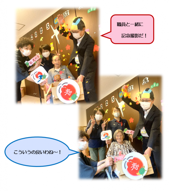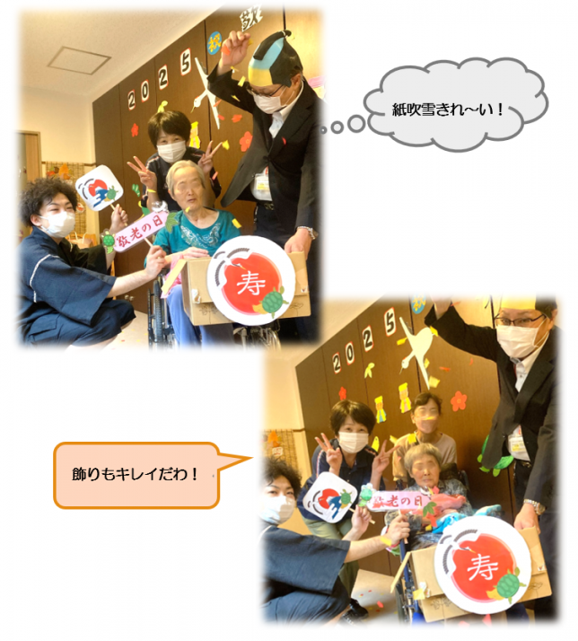 毎年恒例のプレゼント贈呈と記念撮影をユニット毎で行いました!施設長が紙吹雪をふわふわと舞っています♪